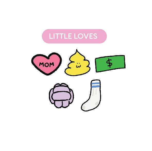 • Little Loves: mom, poop, money, ball, and sock